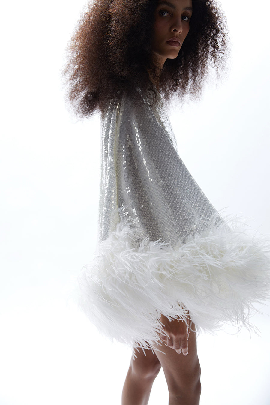 Toutes les plumes sont 100 % plumes d'autruche. Elles sont produites dans le respect total du cadre de production durable et proviennent d'élevages certifiés. Conservez-les dans un environnement frais et sec. Comme les plumes ne sont pas synthétiques, il est probable qu'elles perdent un peu de poils. Toutes les plumes sont cousues à la main sur la robe. Avant de remettre la robe au nettoyage à sec, les plumes doivent être retirées et recousues après le nettoyage de la robe.