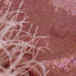 Tutte le piume sono piume di struzzo tinte al 100%. Sono prodotte con il pieno impegno nel quadro della produzione sostenibile e provengono da allevamenti certificati. Conservare in un ambiente fresco e asciutto. Tenere lontano da acqua e umidità per evitare scolorimento. Poiché le piume non sono sintetiche, è previsto che si verifichi una certa quantità di perdita. Tutte le piume sono cucite a mano all'abito. Prima di consegnare l'abito per la pulizia a secco, le piume devono essere rimosse e cucite di nuovo dopo che l'abito è stato pulito.
