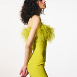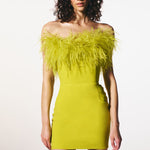Tutte le piume sono piume di struzzo tinte al 100%. Sono prodotte con il pieno impegno nel quadro della produzione sostenibile e provengono da allevamenti certificati. Conservare in un ambiente fresco e asciutto. Tenere lontano da acqua e umidità per evitare scolorimenti. Poiché le piume non sono sintetiche, è previsto che si verifichi una certa quantità di perdita. Tutte le piume sono cucite a mano all'abito. Prima di consegnare l'abito per la pulizia a secco, le piume devono essere rimosse e cucite di nuovo dopo che l'abito è stato pulito.