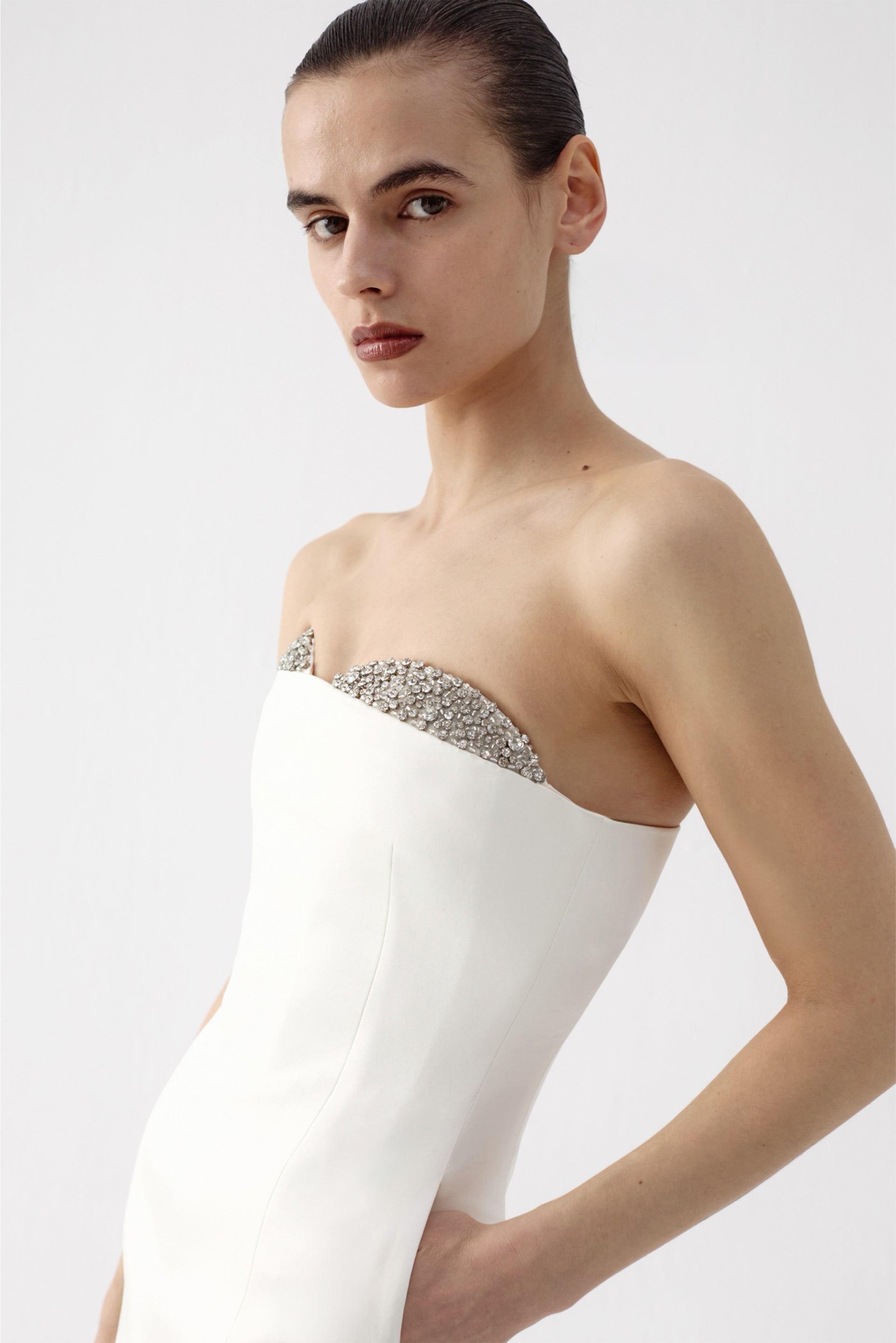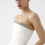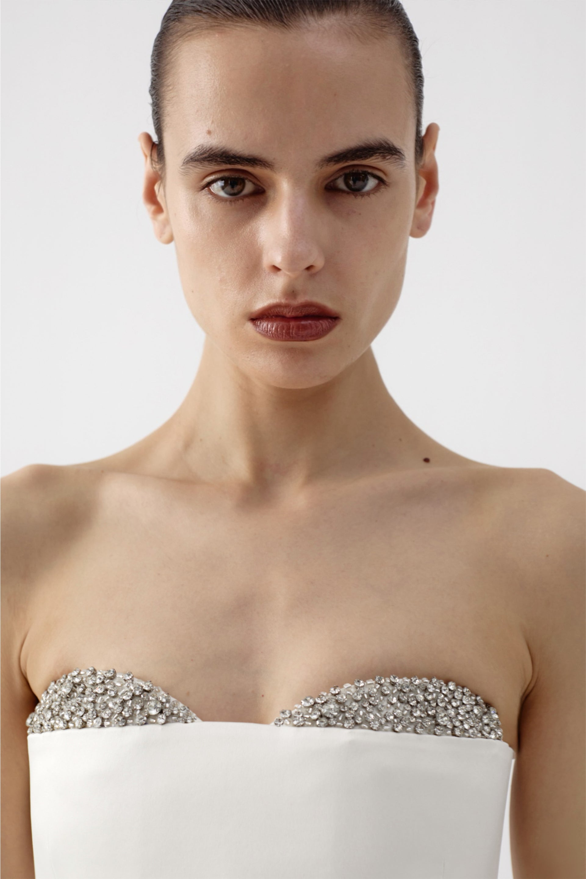 - Handcrafted crystal-embellished bust and straps