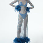 All of the feathers are 100% dyed ostrich feathers. They are produced with full commitment to the framework of sustainable production and are supplied from certified farms. Store in a cool and dry environment. Keep away from water and moisture to avoid discoloration. Since the feathers are not synthetic, it is expected that some amount of shedding will occur. All of the feathers are hand stitched to the dress. Before handing over the dress for dry cleaning, the feathers should be removed and sewn again after the dress has been cleaned.