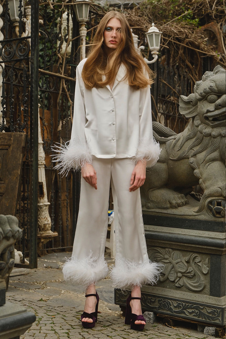 All of the feathers are 100% ostrich feathers. They are produced with full commitment to the framework of sustainable production and are supplied from certified farms. Store in a cool and dry environment. Since the feathers are not synthetic, it is expected that some amount of shedding will occur. All of the feathers are hand stitched to the dress. Before handing over the dress for dry cleaning, the feathers should be removed and sewn again after the dress has been cleaned.