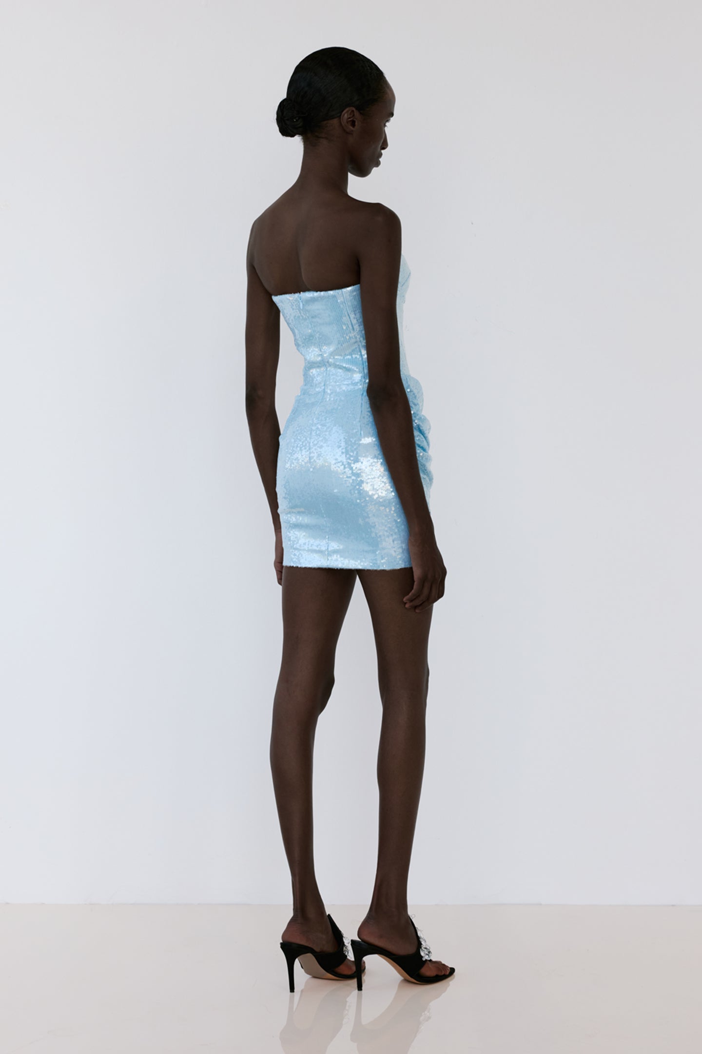 - Sequin surface with sculpted corset seams